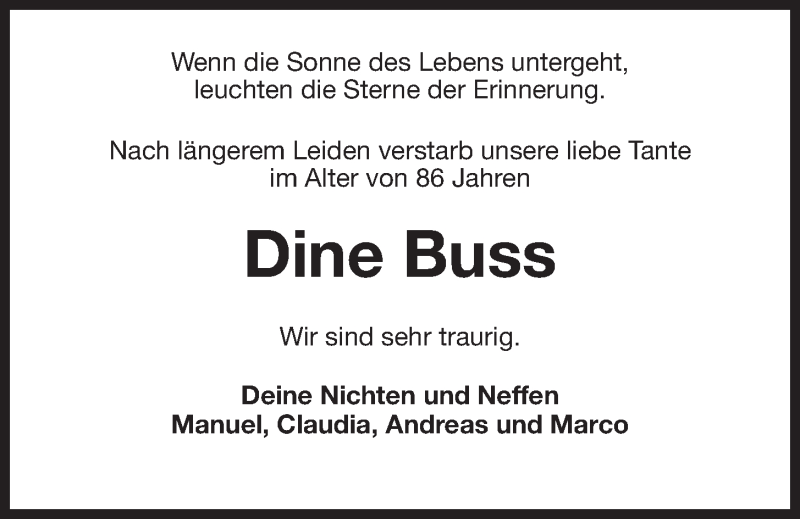Hier finden Sie alle Traueranzeigen aus der Zeitung, die bisher für Dine Buss erschienen sind. Weitere Traueranzeigen, die in der Zeitung erscheinen, werden hier ebenfalls aufgelistet