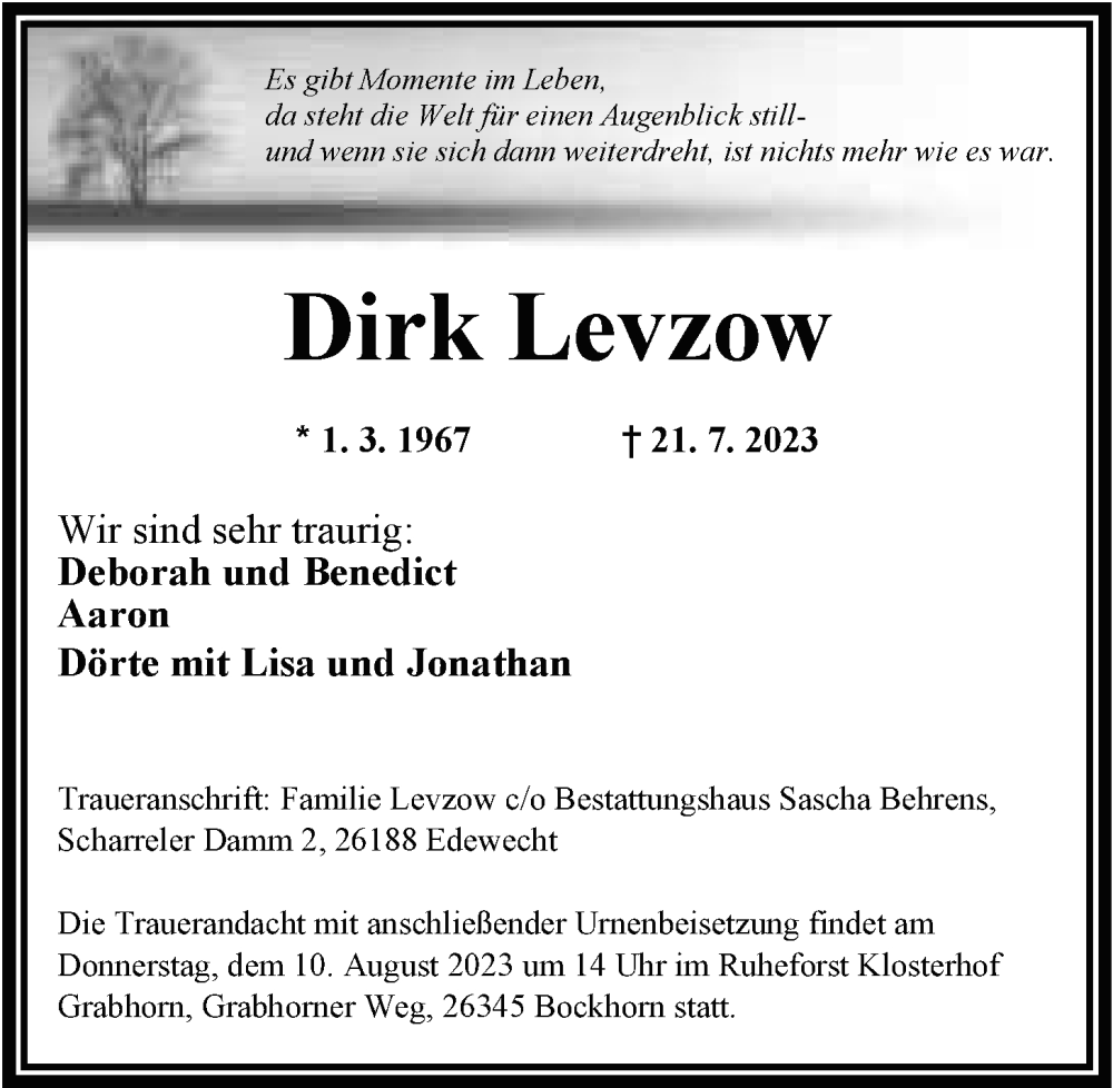 Hier finden Sie alle Traueranzeigen aus der Zeitung, die bisher für Dirk Levzow erschienen sind. Weitere Traueranzeigen, die in der Zeitung erscheinen, werden hier ebenfalls aufgelistet