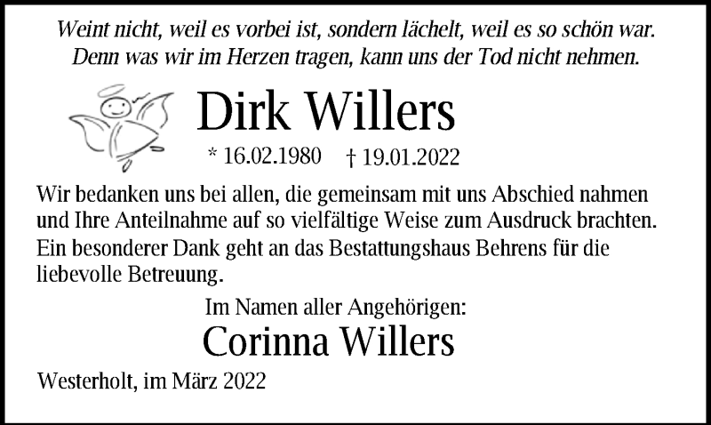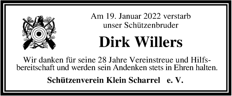 Hier finden Sie alle Traueranzeigen aus der Zeitung, die bisher für Dirk Willers erschienen sind. Weitere Traueranzeigen, die in der Zeitung erscheinen, werden hier ebenfalls aufgelistet
