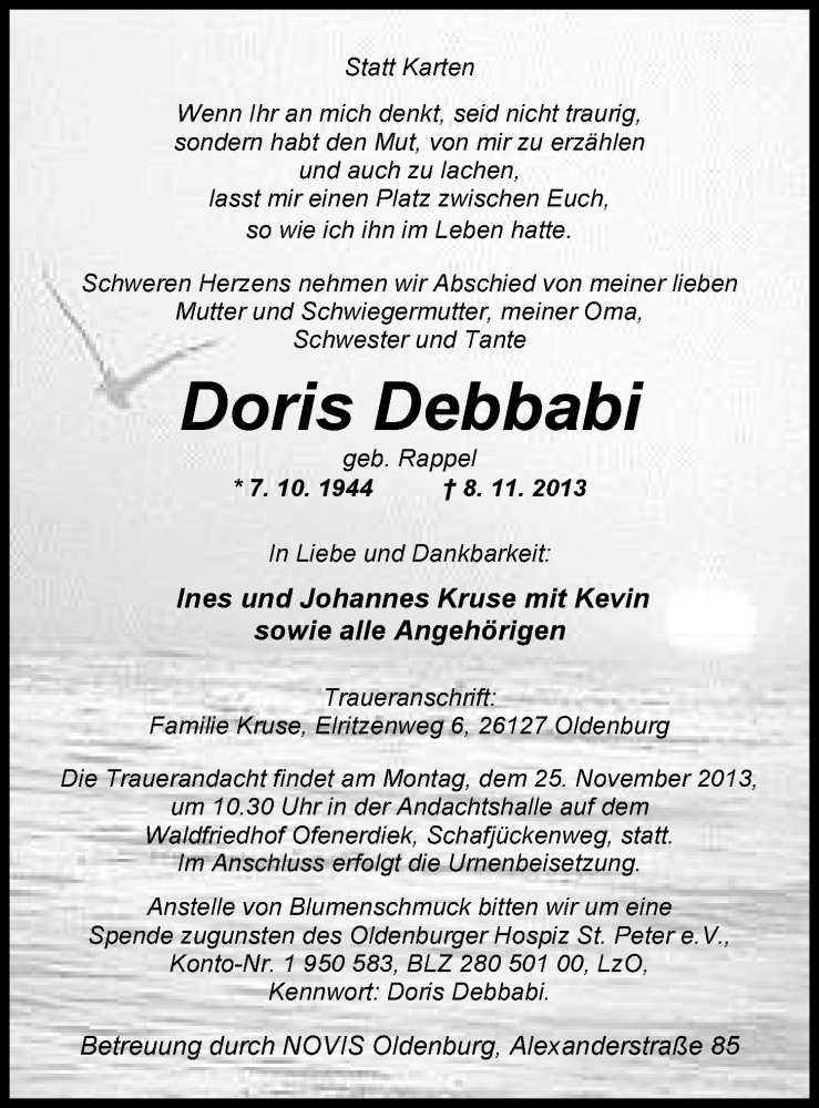 Hier finden Sie alle Traueranzeigen aus der Zeitung, die bisher für Doris Debbabi erschienen sind. Weitere Traueranzeigen, die in der Zeitung erscheinen, werden hier ebenfalls aufgelistet
