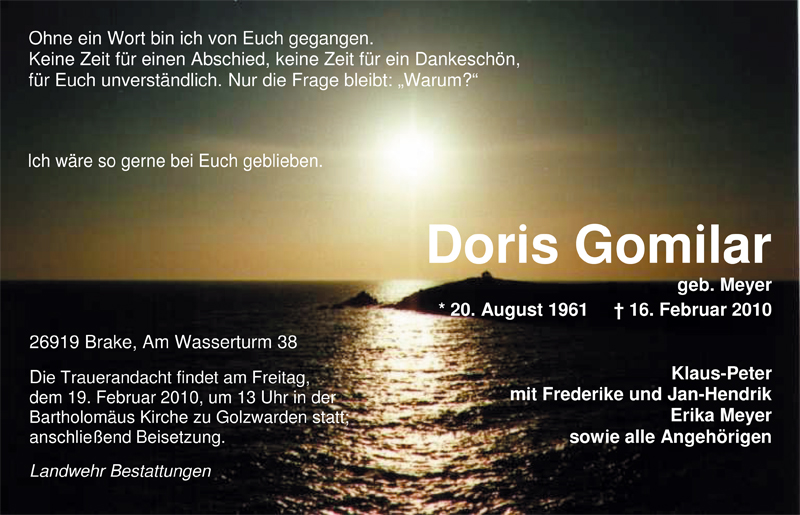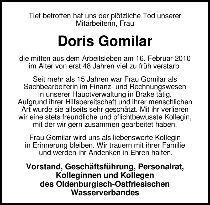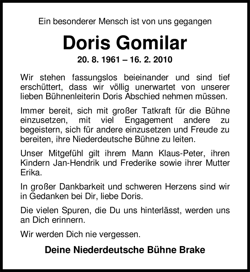 Hier finden Sie alle Traueranzeigen aus der Zeitung, die bisher für Doris Gomilar erschienen sind. Weitere Traueranzeigen, die in der Zeitung erscheinen, werden hier ebenfalls aufgelistet