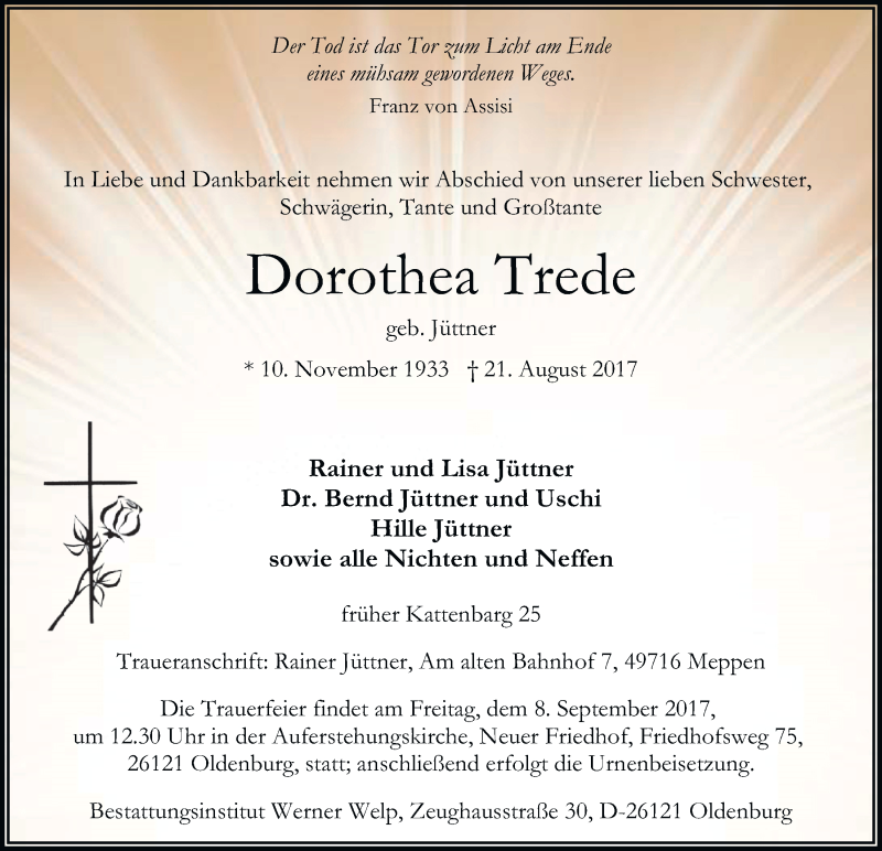 Hier finden Sie alle Traueranzeigen aus der Zeitung, die bisher für Dorothea Trede erschienen sind. Weitere Traueranzeigen, die in der Zeitung erscheinen, werden hier ebenfalls aufgelistet