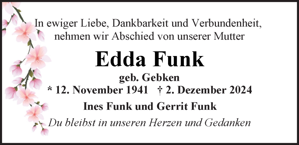 Hier finden Sie alle Traueranzeigen aus der Zeitung, die bisher für Edda Funk erschienen sind. Weitere Traueranzeigen, die in der Zeitung erscheinen, werden hier ebenfalls aufgelistet