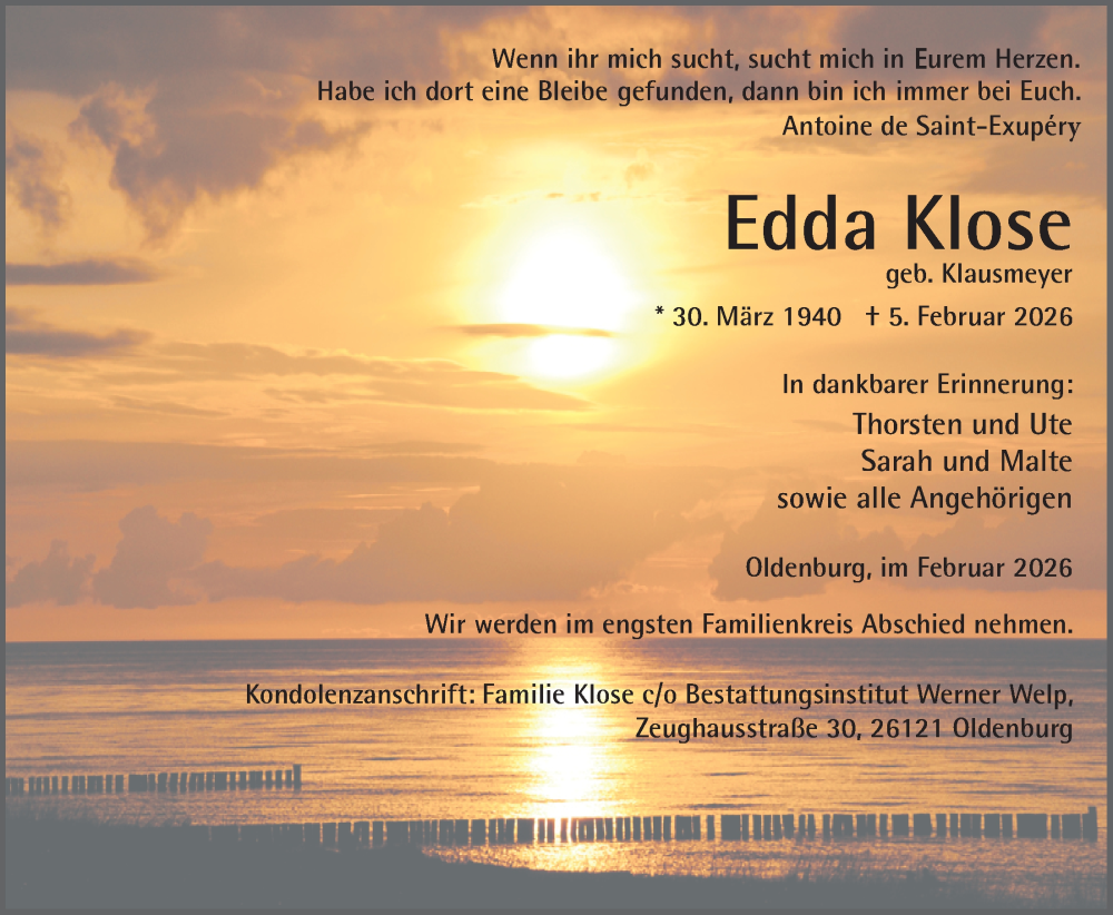 Hier finden Sie alle Traueranzeigen aus der Zeitung, die bisher für Edda Klose erschienen sind. Weitere Traueranzeigen, die in der Zeitung erscheinen, werden hier ebenfalls aufgelistet