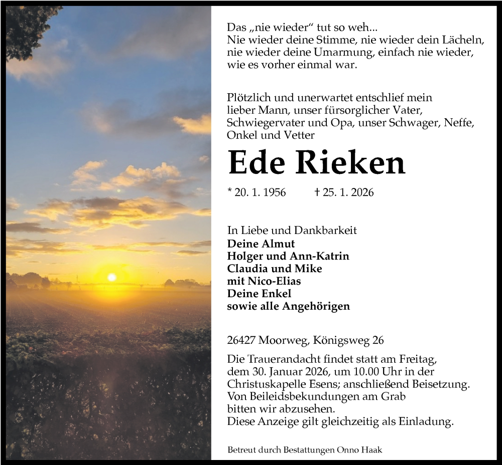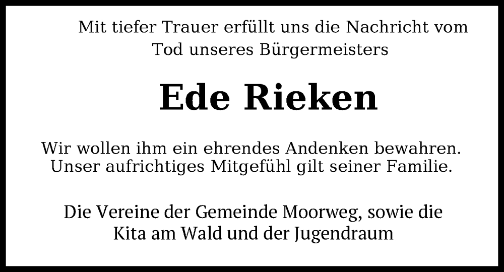 Hier finden Sie alle Traueranzeigen aus der Zeitung, die bisher für Ede Rieken erschienen sind. Weitere Traueranzeigen, die in der Zeitung erscheinen, werden hier ebenfalls aufgelistet