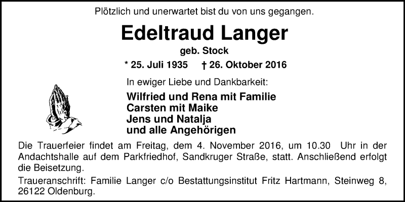 Hier finden Sie alle Traueranzeigen aus der Zeitung, die bisher für Edeltraud Langer erschienen sind. Weitere Traueranzeigen, die in der Zeitung erscheinen, werden hier ebenfalls aufgelistet