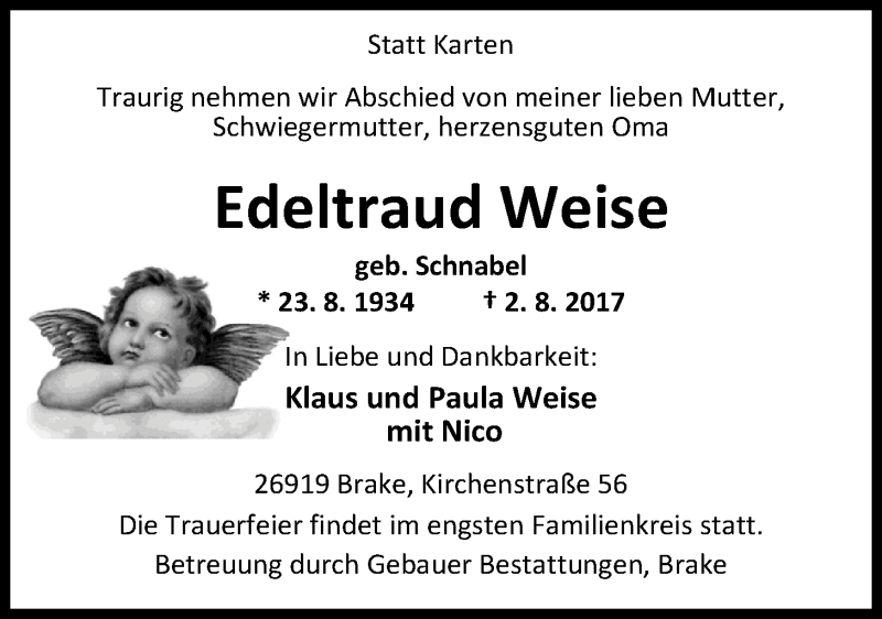 Hier finden Sie alle Traueranzeigen aus der Zeitung, die bisher für Edeltraud Weise erschienen sind. Weitere Traueranzeigen, die in der Zeitung erscheinen, werden hier ebenfalls aufgelistet