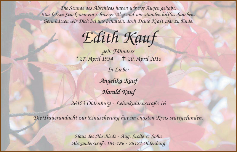 Hier finden Sie alle Traueranzeigen aus der Zeitung, die bisher für Edith Kauf erschienen sind. Weitere Traueranzeigen, die in der Zeitung erscheinen, werden hier ebenfalls aufgelistet