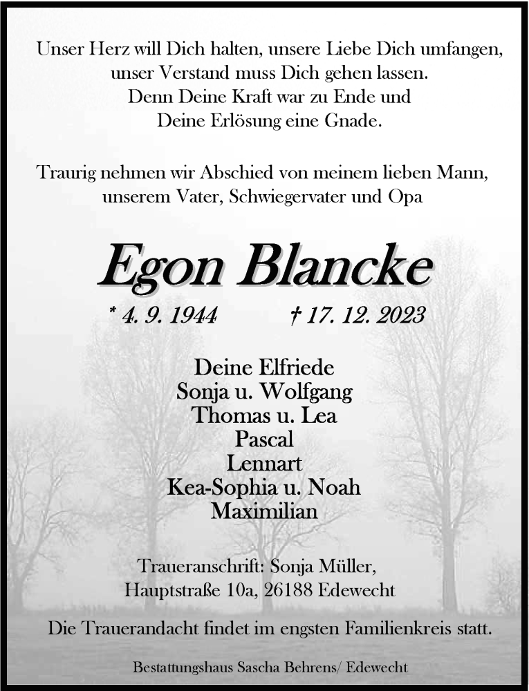 Hier finden Sie alle Traueranzeigen aus der Zeitung, die bisher für Egon August Blancke erschienen sind. Weitere Traueranzeigen, die in der Zeitung erscheinen, werden hier ebenfalls aufgelistet