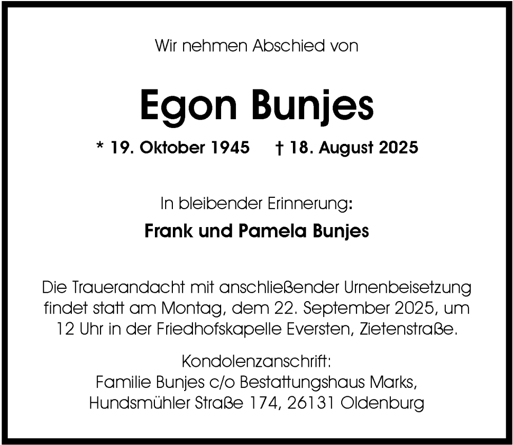 Hier finden Sie alle Traueranzeigen aus der Zeitung, die bisher für Egon Bunjes erschienen sind. Weitere Traueranzeigen, die in der Zeitung erscheinen, werden hier ebenfalls aufgelistet