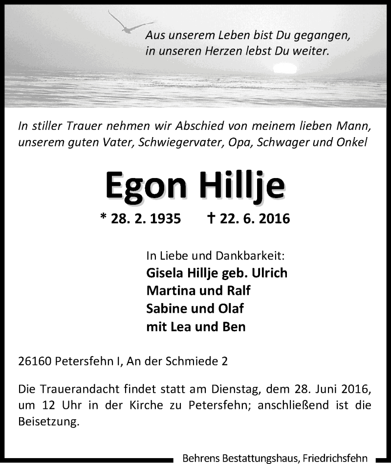 Hier finden Sie alle Traueranzeigen aus der Zeitung, die bisher für Egon Hillje erschienen sind. Weitere Traueranzeigen, die in der Zeitung erscheinen, werden hier ebenfalls aufgelistet