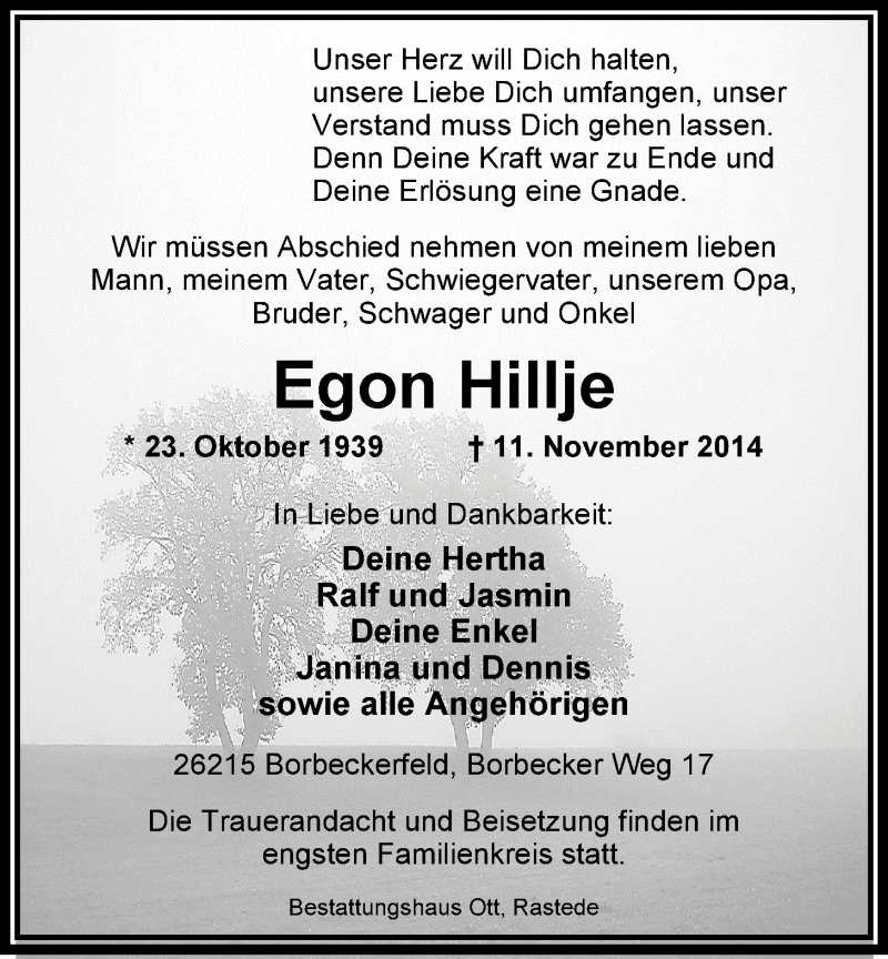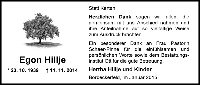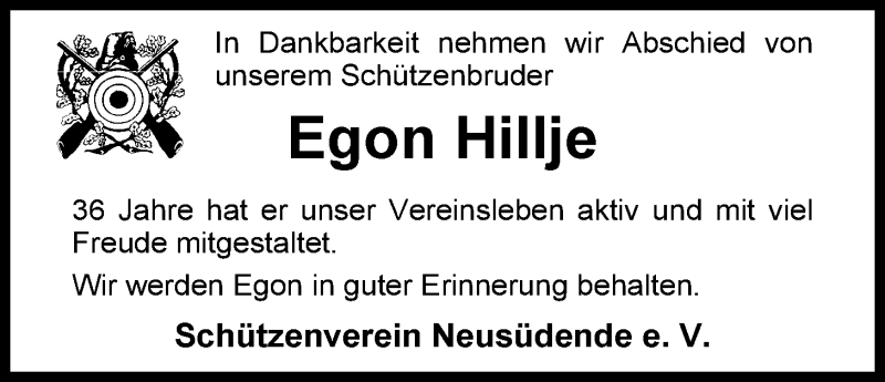 Hier finden Sie alle Traueranzeigen aus der Zeitung, die bisher für Egon Hillje erschienen sind. Weitere Traueranzeigen, die in der Zeitung erscheinen, werden hier ebenfalls aufgelistet