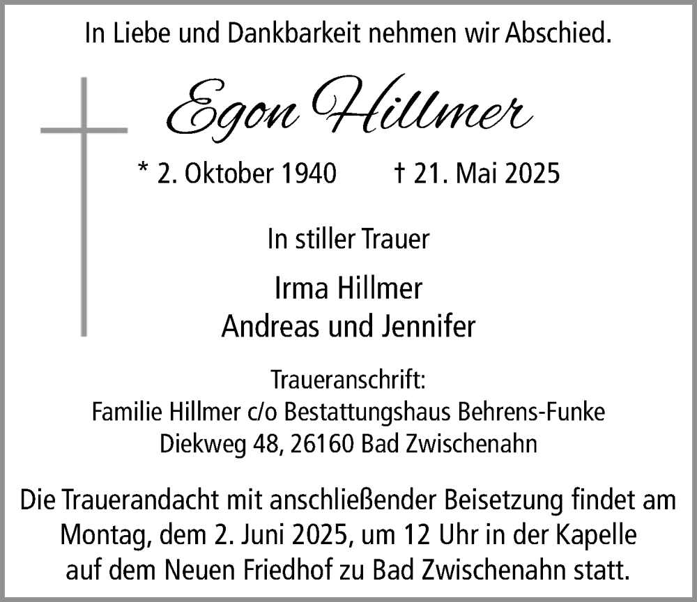 Hier finden Sie alle Traueranzeigen aus der Zeitung, die bisher für Egon Hillmer erschienen sind. Weitere Traueranzeigen, die in der Zeitung erscheinen, werden hier ebenfalls aufgelistet