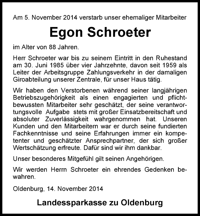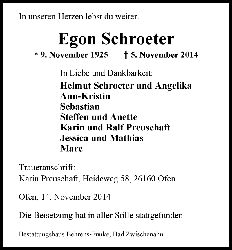 Hier finden Sie alle Traueranzeigen aus der Zeitung, die bisher für Egon Schroeter erschienen sind. Weitere Traueranzeigen, die in der Zeitung erscheinen, werden hier ebenfalls aufgelistet