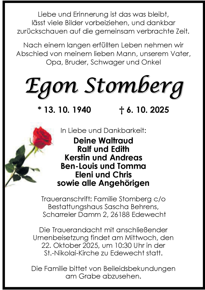 Hier finden Sie alle Traueranzeigen aus der Zeitung, die bisher für Egon Stomberg erschienen sind. Weitere Traueranzeigen, die in der Zeitung erscheinen, werden hier ebenfalls aufgelistet