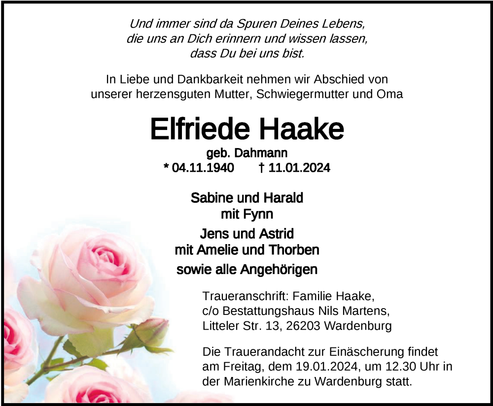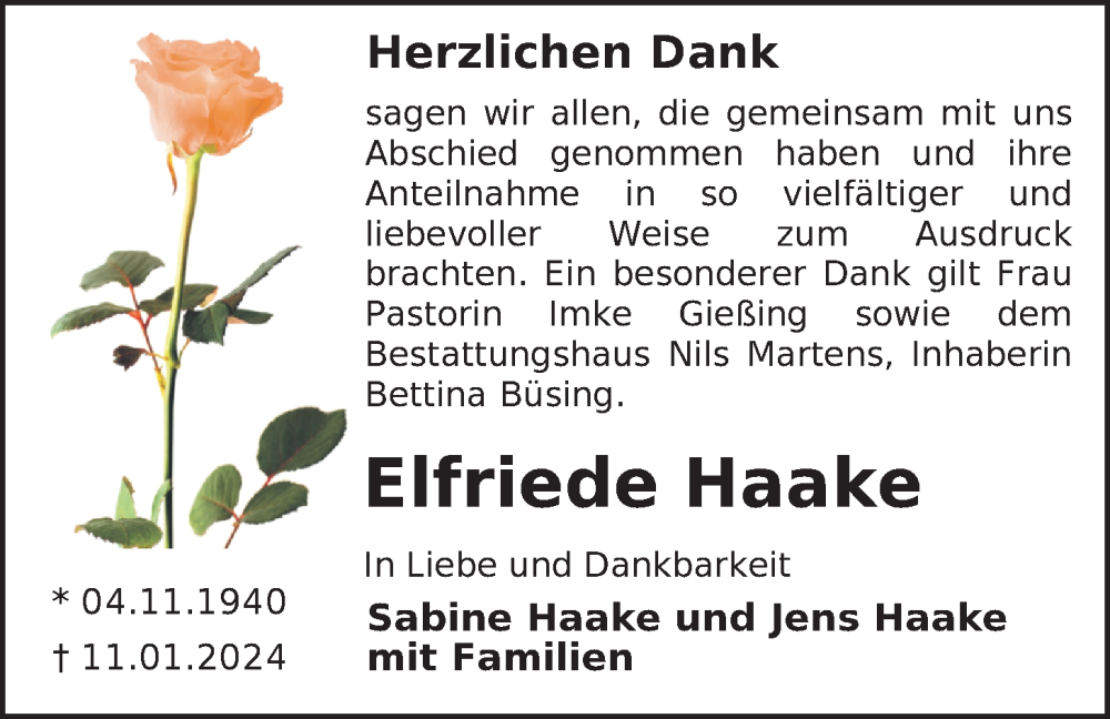 Hier finden Sie alle Traueranzeigen aus der Zeitung, die bisher für Elfriede Haake erschienen sind. Weitere Traueranzeigen, die in der Zeitung erscheinen, werden hier ebenfalls aufgelistet