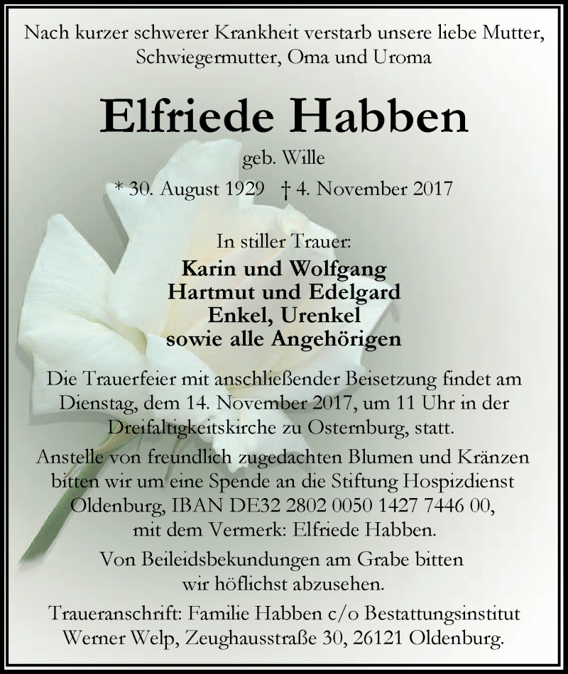 Hier finden Sie alle Traueranzeigen aus der Zeitung, die bisher für Elfriede Habben erschienen sind. Weitere Traueranzeigen, die in der Zeitung erscheinen, werden hier ebenfalls aufgelistet