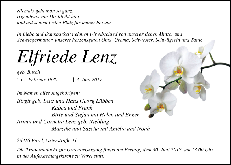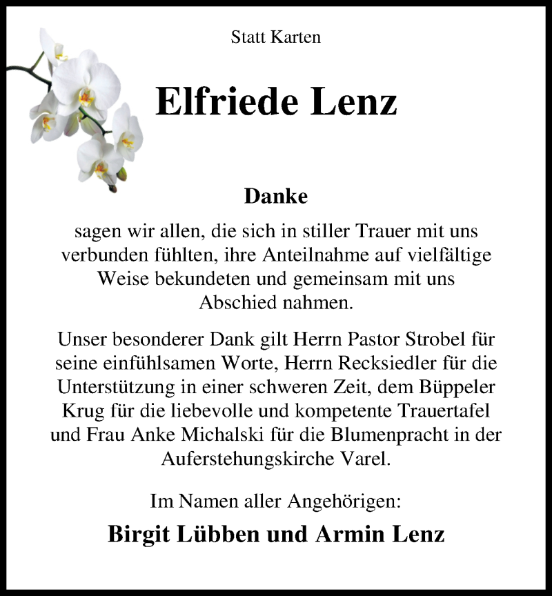 Hier finden Sie alle Traueranzeigen aus der Zeitung, die bisher für Elfriede Lenz erschienen sind. Weitere Traueranzeigen, die in der Zeitung erscheinen, werden hier ebenfalls aufgelistet
