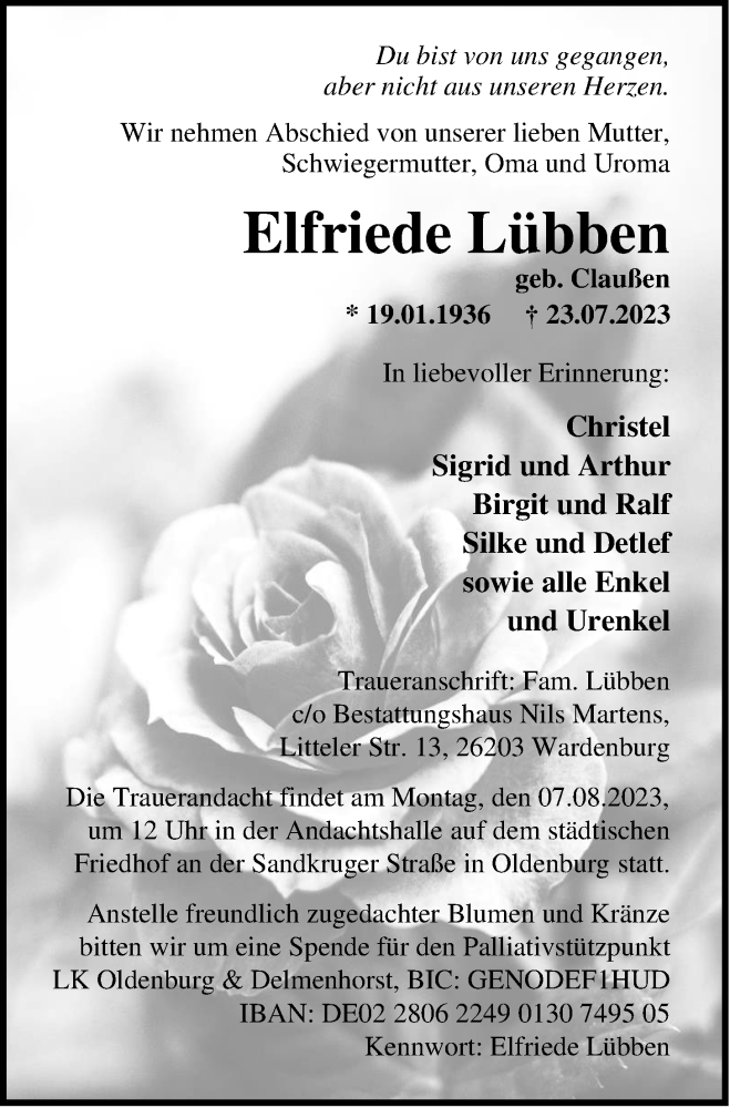 Hier finden Sie alle Traueranzeigen aus der Zeitung, die bisher für Elfriede Lübben erschienen sind. Weitere Traueranzeigen, die in der Zeitung erscheinen, werden hier ebenfalls aufgelistet