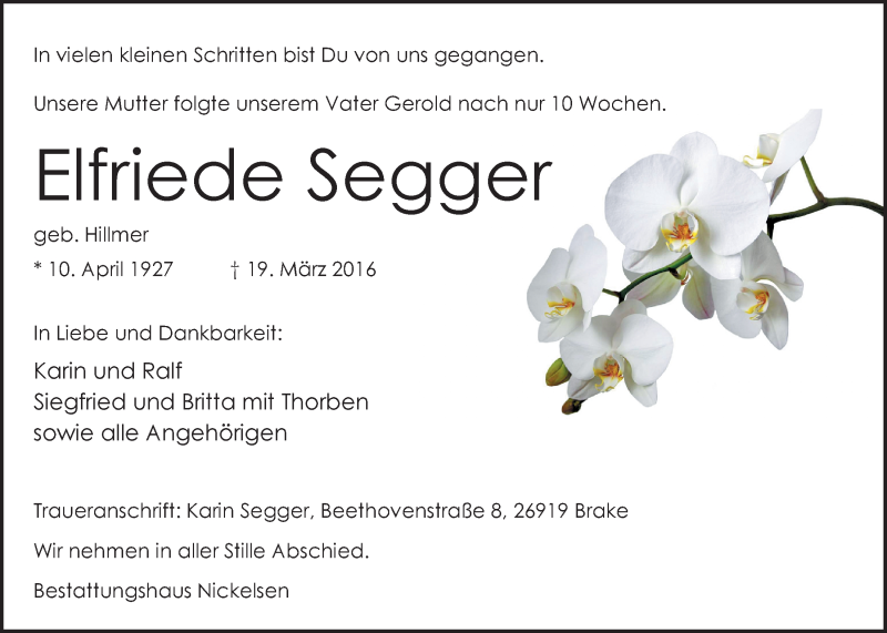 Hier finden Sie alle Traueranzeigen aus der Zeitung, die bisher für Elfriede Segger erschienen sind. Weitere Traueranzeigen, die in der Zeitung erscheinen, werden hier ebenfalls aufgelistet