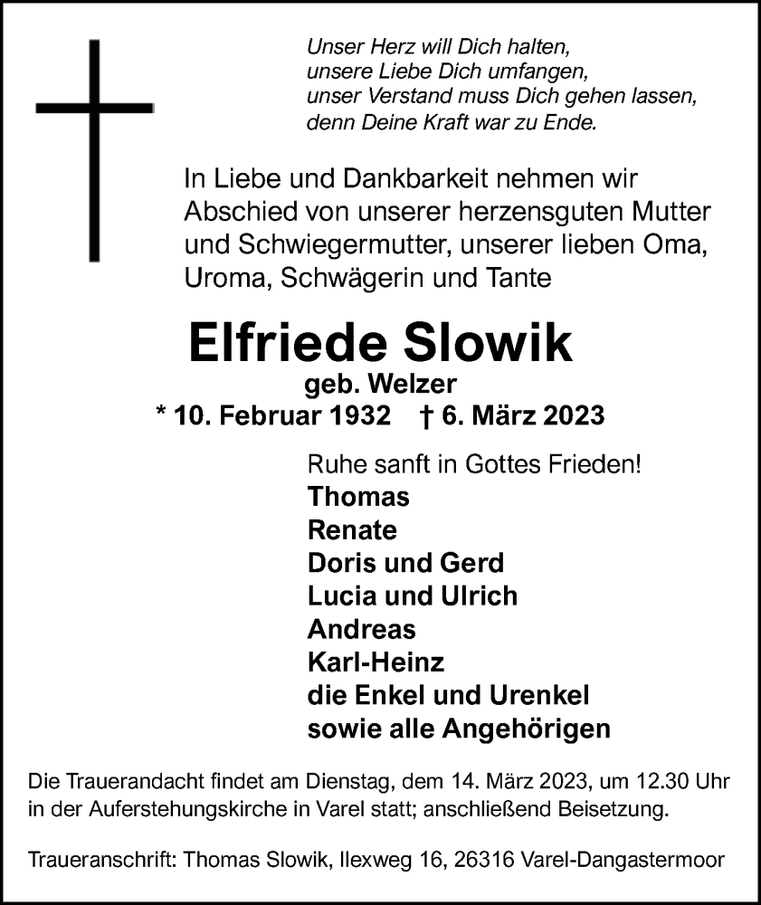 Hier finden Sie alle Traueranzeigen aus der Zeitung, die bisher für Elfriede Slowik erschienen sind. Weitere Traueranzeigen, die in der Zeitung erscheinen, werden hier ebenfalls aufgelistet