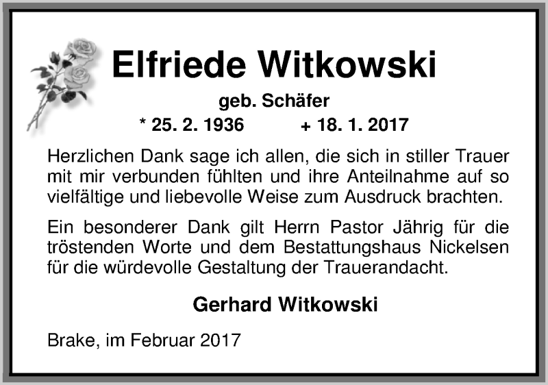Hier finden Sie alle Traueranzeigen aus der Zeitung, die bisher für Elfriede Witkowski erschienen sind. Weitere Traueranzeigen, die in der Zeitung erscheinen, werden hier ebenfalls aufgelistet