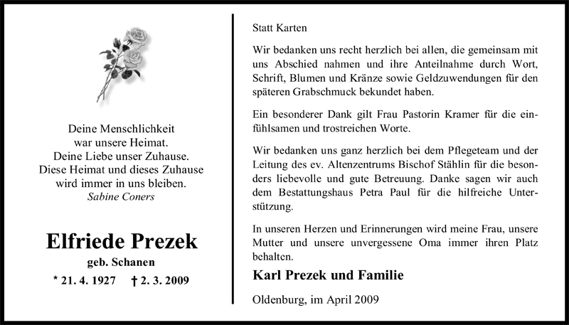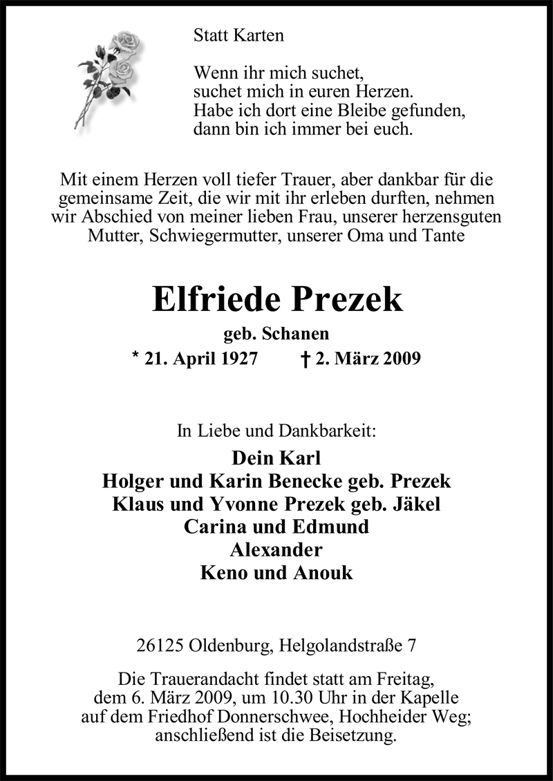 Hier finden Sie alle Traueranzeigen aus der Zeitung, die bisher für Elfriede Prezek erschienen sind. Weitere Traueranzeigen, die in der Zeitung erscheinen, werden hier ebenfalls aufgelistet