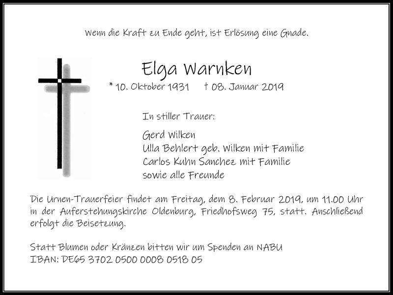 Hier finden Sie alle Traueranzeigen aus der Zeitung, die bisher für Elga Warnken erschienen sind. Weitere Traueranzeigen, die in der Zeitung erscheinen, werden hier ebenfalls aufgelistet