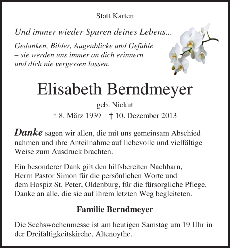 Hier finden Sie alle Traueranzeigen aus der Zeitung, die bisher für Elisabeth Berndmeyer erschienen sind. Weitere Traueranzeigen, die in der Zeitung erscheinen, werden hier ebenfalls aufgelistet
