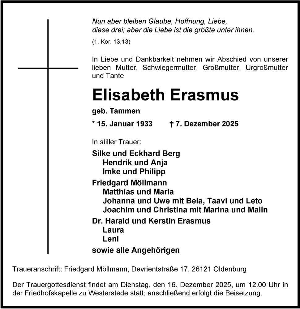 Hier finden Sie alle Traueranzeigen aus der Zeitung, die bisher für Elisabeth Erasmus erschienen sind. Weitere Traueranzeigen, die in der Zeitung erscheinen, werden hier ebenfalls aufgelistet