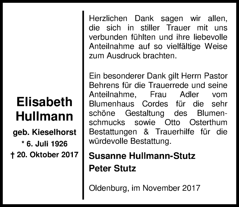 Hier finden Sie alle Traueranzeigen aus der Zeitung, die bisher für Elisabeth Hullmann erschienen sind. Weitere Traueranzeigen, die in der Zeitung erscheinen, werden hier ebenfalls aufgelistet