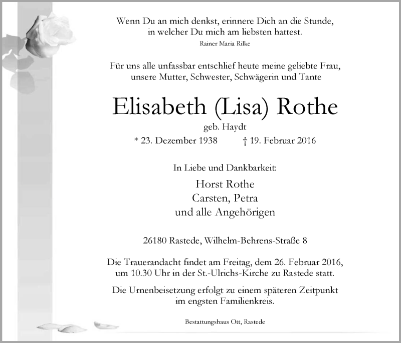 Hier finden Sie alle Traueranzeigen aus der Zeitung, die bisher für Elisabeth Rothe erschienen sind. Weitere Traueranzeigen, die in der Zeitung erscheinen, werden hier ebenfalls aufgelistet