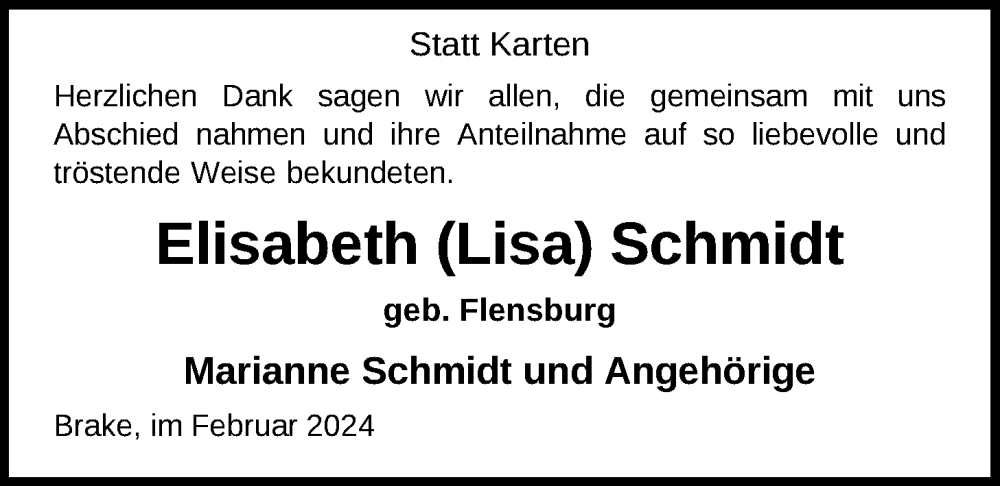 Hier finden Sie alle Traueranzeigen aus der Zeitung, die bisher für Elisabeth Schmidt erschienen sind. Weitere Traueranzeigen, die in der Zeitung erscheinen, werden hier ebenfalls aufgelistet