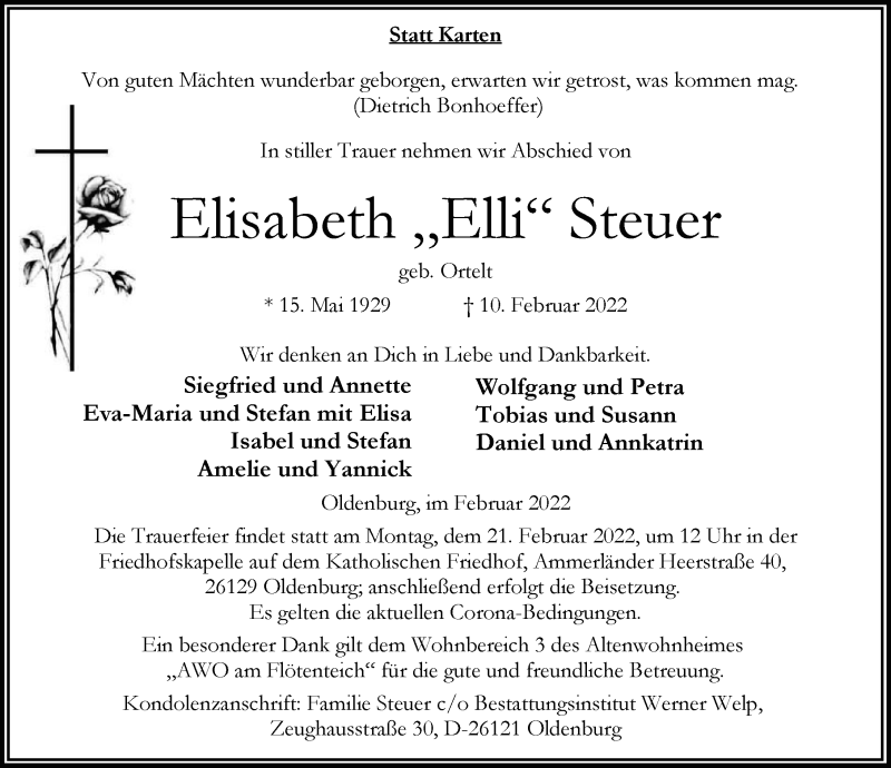 Hier finden Sie alle Traueranzeigen aus der Zeitung, die bisher für Elisabeth Steuer erschienen sind. Weitere Traueranzeigen, die in der Zeitung erscheinen, werden hier ebenfalls aufgelistet