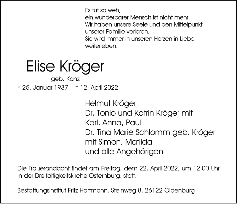 Hier finden Sie alle Traueranzeigen aus der Zeitung, die bisher für Elise Kröger erschienen sind. Weitere Traueranzeigen, die in der Zeitung erscheinen, werden hier ebenfalls aufgelistet