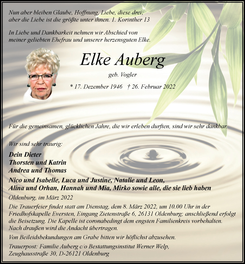 Hier finden Sie alle Traueranzeigen aus der Zeitung, die bisher für Elke Auberg erschienen sind. Weitere Traueranzeigen, die in der Zeitung erscheinen, werden hier ebenfalls aufgelistet