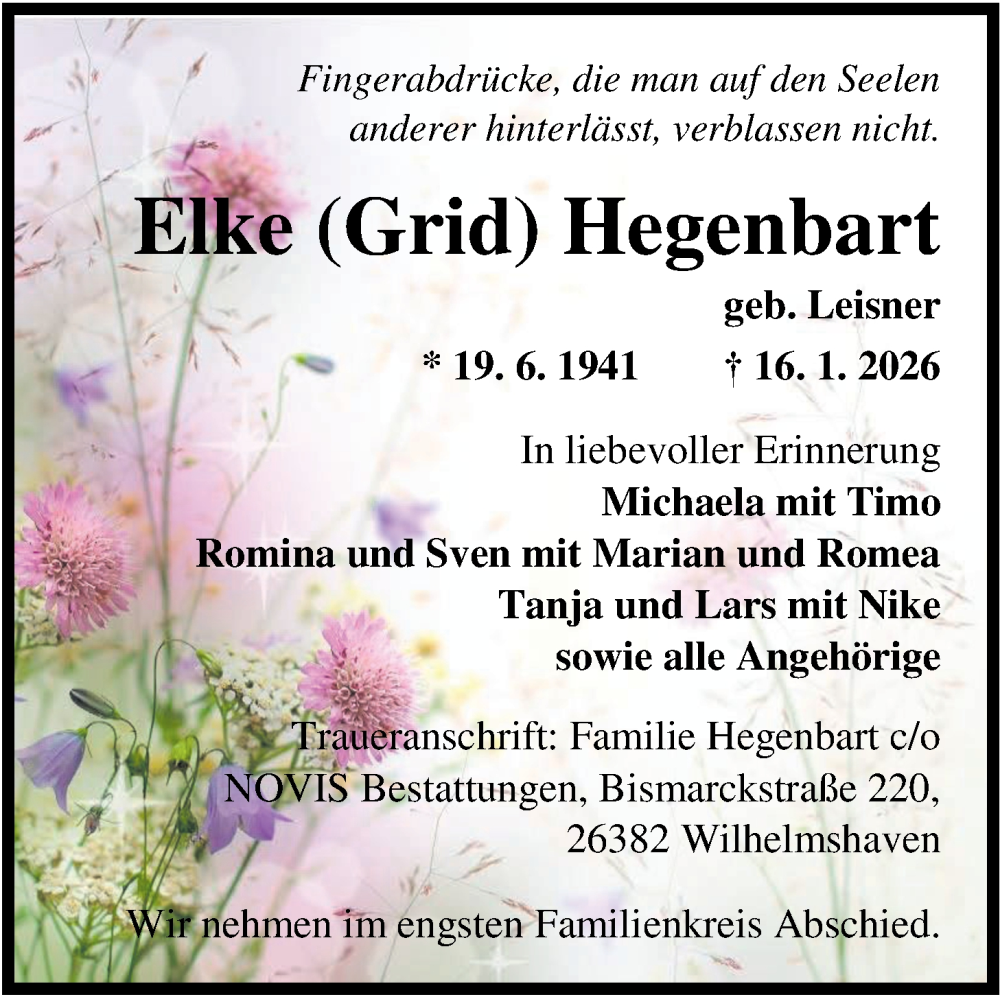 Hier finden Sie alle Traueranzeigen aus der Zeitung, die bisher für Elke Hegenbart erschienen sind. Weitere Traueranzeigen, die in der Zeitung erscheinen, werden hier ebenfalls aufgelistet