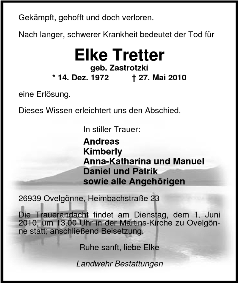 Hier finden Sie alle Traueranzeigen aus der Zeitung, die bisher für Elke Tretter erschienen sind. Weitere Traueranzeigen, die in der Zeitung erscheinen, werden hier ebenfalls aufgelistet