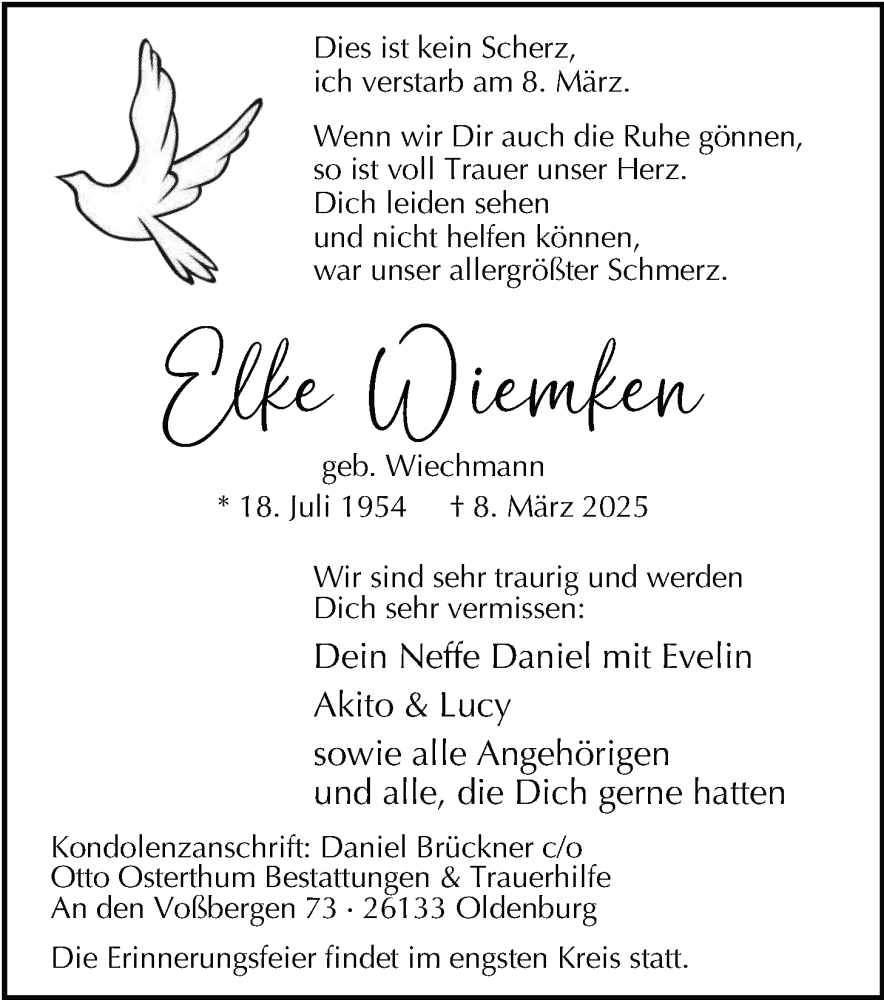 Hier finden Sie alle Traueranzeigen aus der Zeitung, die bisher für Elke Wiemken erschienen sind. Weitere Traueranzeigen, die in der Zeitung erscheinen, werden hier ebenfalls aufgelistet