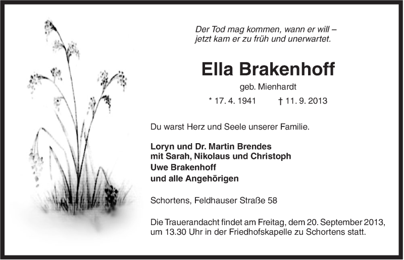 Hier finden Sie alle Traueranzeigen aus der Zeitung, die bisher für Ella Brakenhoff erschienen sind. Weitere Traueranzeigen, die in der Zeitung erscheinen, werden hier ebenfalls aufgelistet