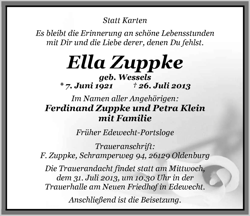 Hier finden Sie alle Traueranzeigen aus der Zeitung, die bisher für Ella Zuppke erschienen sind. Weitere Traueranzeigen, die in der Zeitung erscheinen, werden hier ebenfalls aufgelistet