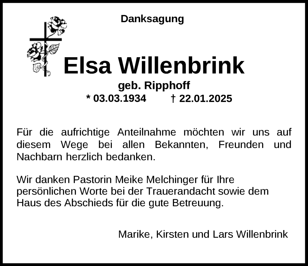 Hier finden Sie alle Traueranzeigen aus der Zeitung, die bisher für Elsa Willenbrink erschienen sind. Weitere Traueranzeigen, die in der Zeitung erscheinen, werden hier ebenfalls aufgelistet
