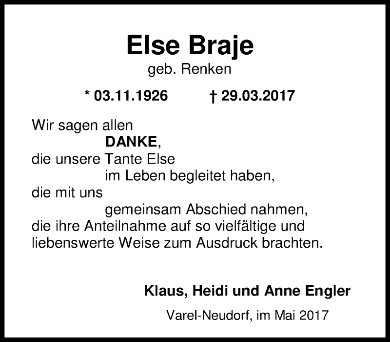 Hier finden Sie alle Traueranzeigen aus der Zeitung, die bisher für Else Braje erschienen sind. Weitere Traueranzeigen, die in der Zeitung erscheinen, werden hier ebenfalls aufgelistet