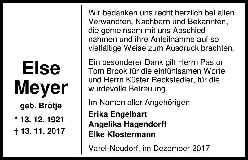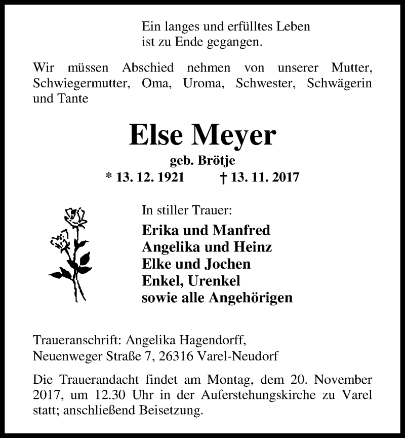 Hier finden Sie alle Traueranzeigen aus der Zeitung, die bisher für Else Meyer erschienen sind. Weitere Traueranzeigen, die in der Zeitung erscheinen, werden hier ebenfalls aufgelistet