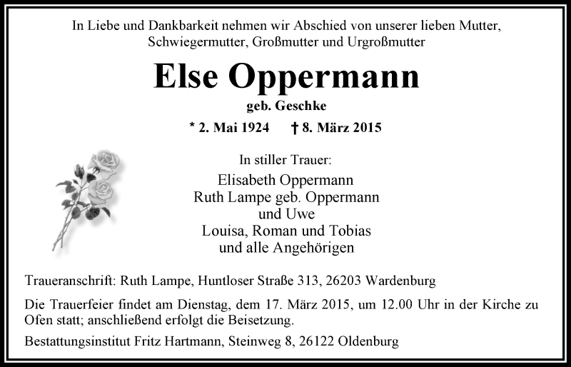 Hier finden Sie alle Traueranzeigen aus der Zeitung, die bisher für Else Oppermann erschienen sind. Weitere Traueranzeigen, die in der Zeitung erscheinen, werden hier ebenfalls aufgelistet