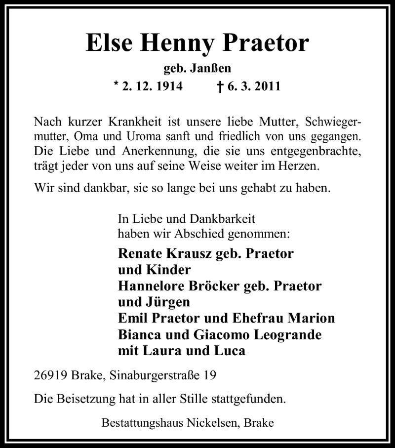 Hier finden Sie alle Traueranzeigen aus der Zeitung, die bisher für Else Praetor erschienen sind. Weitere Traueranzeigen, die in der Zeitung erscheinen, werden hier ebenfalls aufgelistet