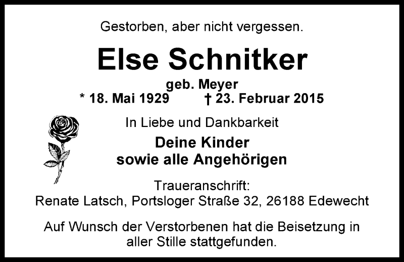 Hier finden Sie alle Traueranzeigen aus der Zeitung, die bisher für Else Schnitker erschienen sind. Weitere Traueranzeigen, die in der Zeitung erscheinen, werden hier ebenfalls aufgelistet