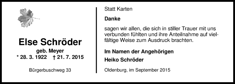 Hier finden Sie alle Traueranzeigen aus der Zeitung, die bisher für Else Schröder erschienen sind. Weitere Traueranzeigen, die in der Zeitung erscheinen, werden hier ebenfalls aufgelistet