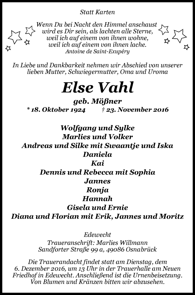 Hier finden Sie alle Traueranzeigen aus der Zeitung, die bisher für Else Vahl erschienen sind. Weitere Traueranzeigen, die in der Zeitung erscheinen, werden hier ebenfalls aufgelistet