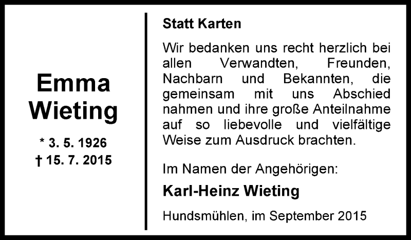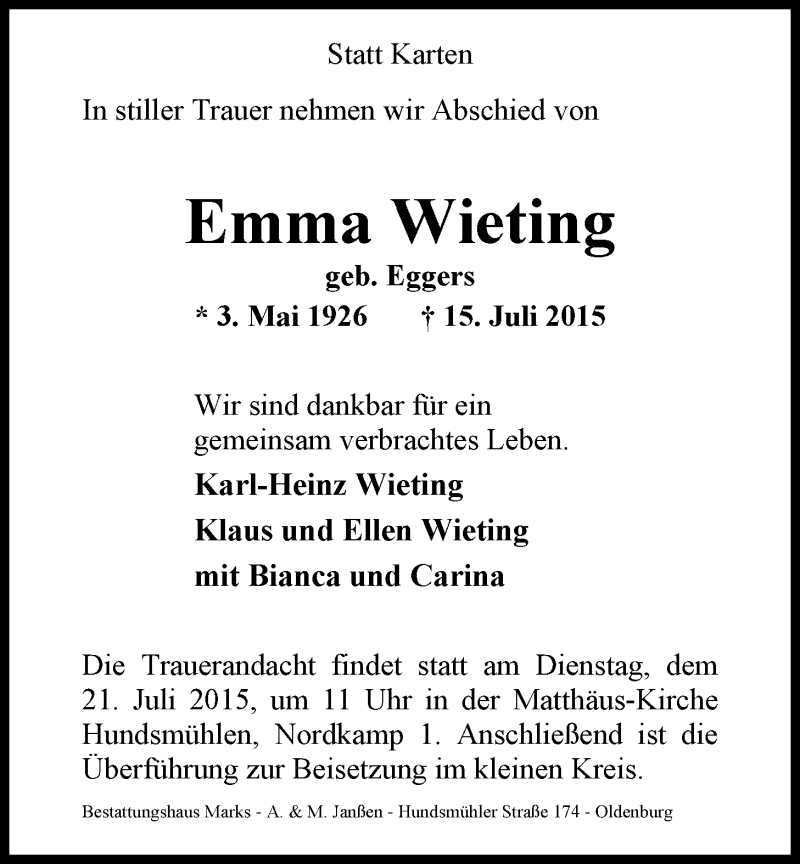 Hier finden Sie alle Traueranzeigen aus der Zeitung, die bisher für Emma Wieting erschienen sind. Weitere Traueranzeigen, die in der Zeitung erscheinen, werden hier ebenfalls aufgelistet